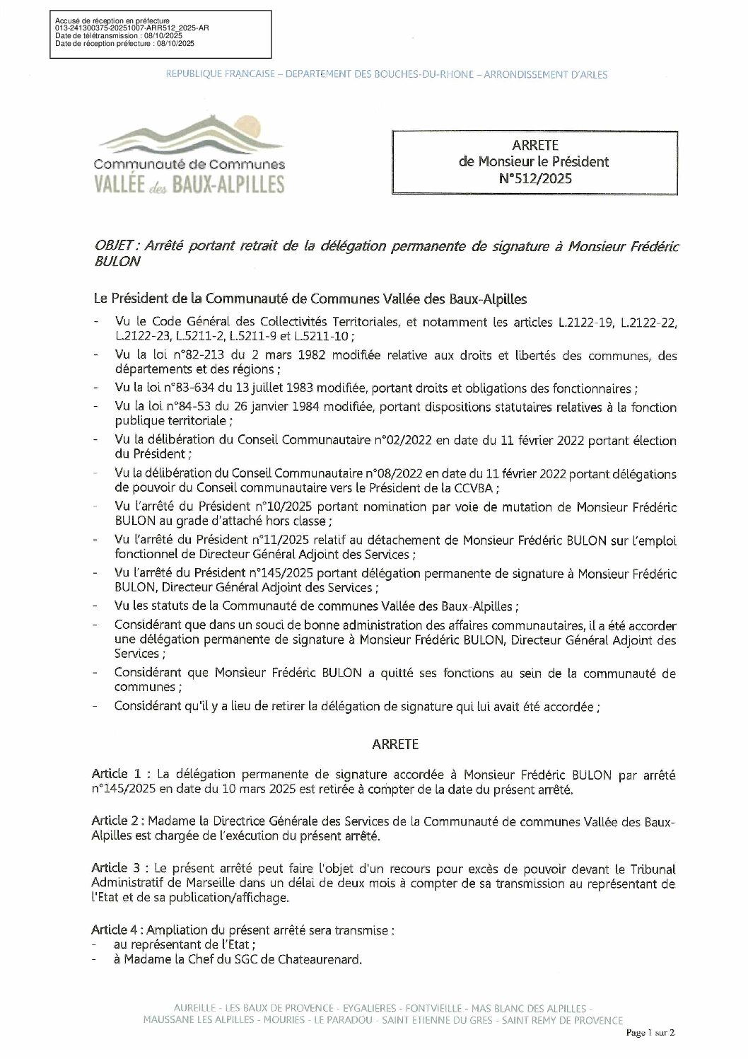 Arrêté n°512/2025 portant retrait de la délégation permanente de signature à Monsieur Frédéric BULON DGA