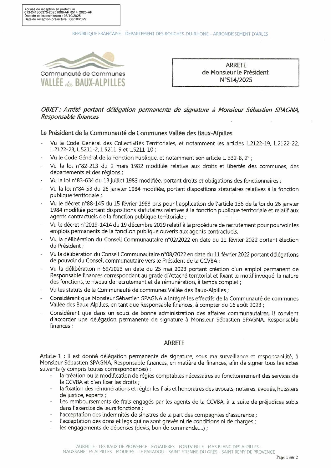 Arrêté n°514/2025 portant délégation permanente de signature à Monsieur Sébastien SPAGNA