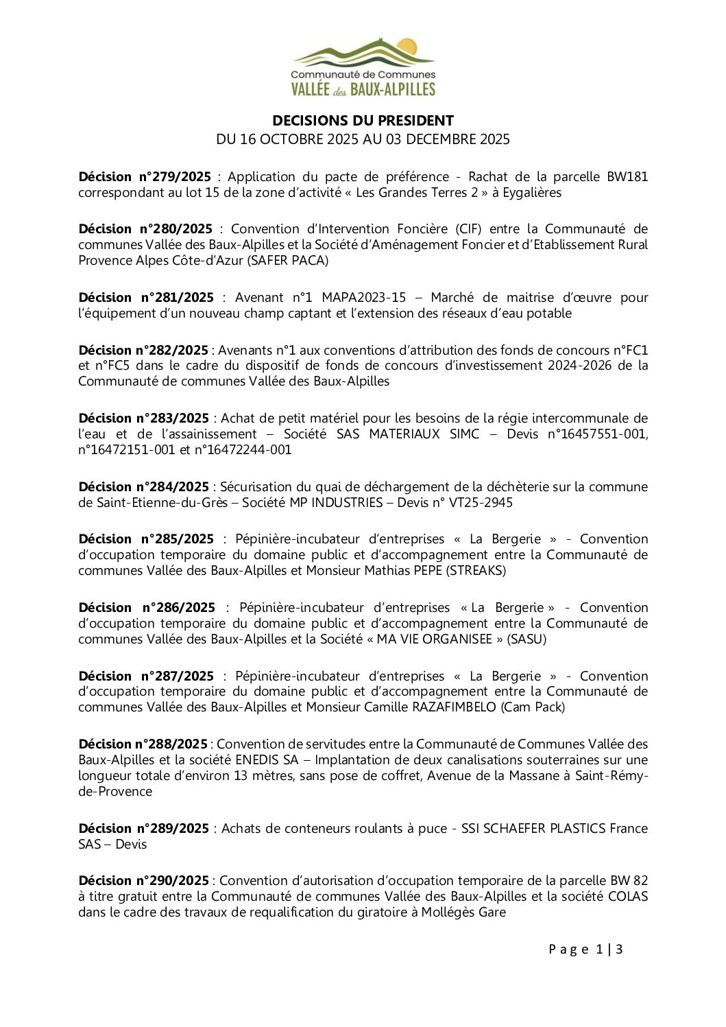 Décisions du président du 16.10.2025 au 03.12.2025