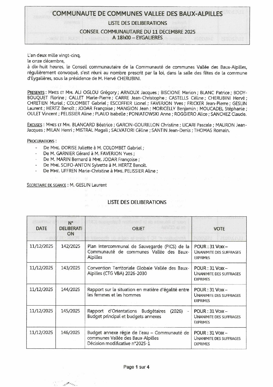 Liste des délibérations du Conseil communautaire du 11 décembre 2025