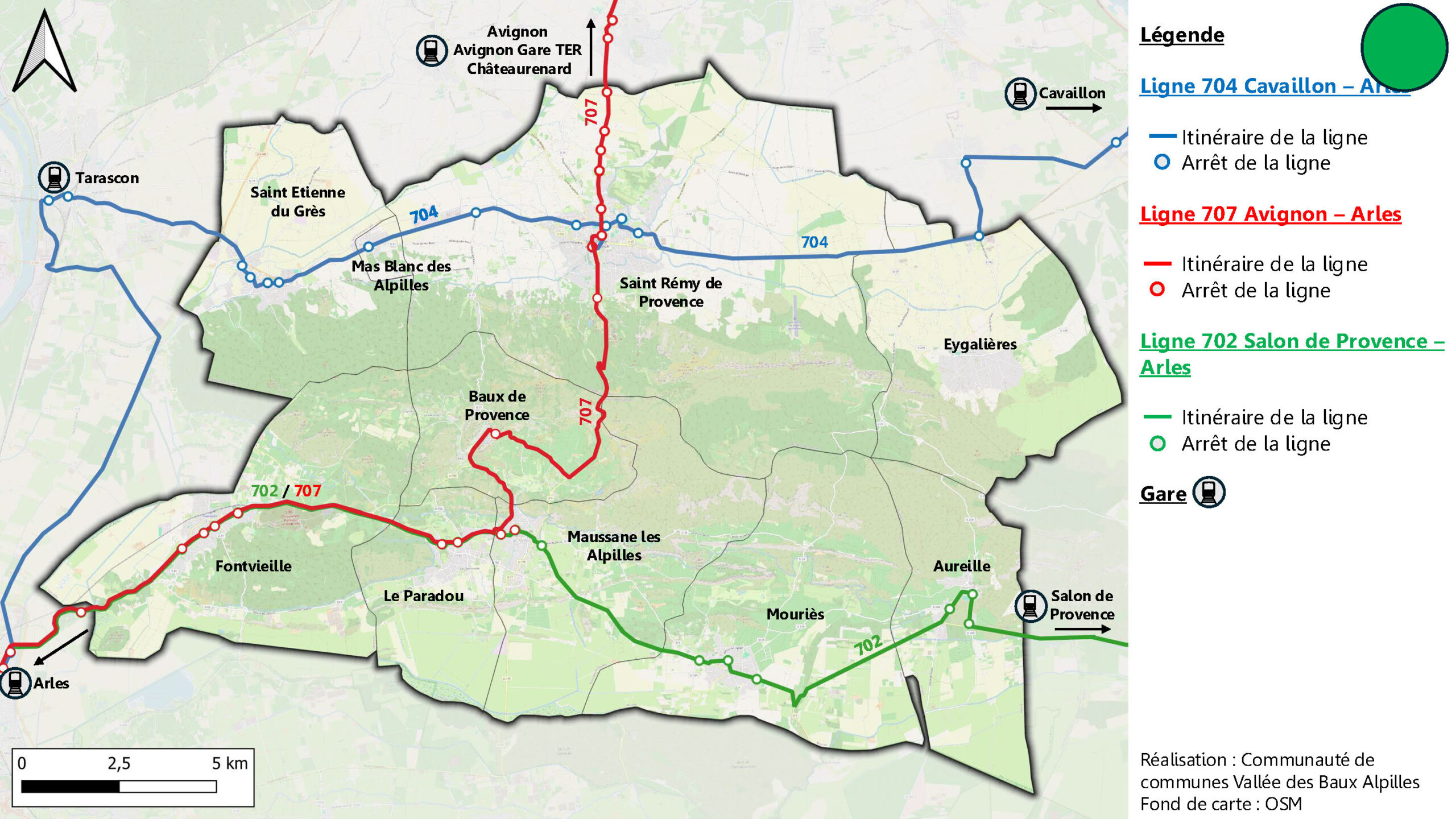 • Ligne 707 Avignon – Saint-Rémy-de-Provence via Rognonas, Châteaurenard, Eyragues – Depuis le 1er septembre 2025, cette ligne propose deux passages quotidiens dans les Alpilles et jusqu’à Arles (du lundi au samedi) Consulter la fiche horaire de la ligne 707 . Durant la période estivale (juillet – août, les trajets entre Saint Rémy de Provence et Arles sont de 6 par sens, par jour mettre lien vers ligne 707 été.